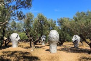 Ugo Rondinone – Four Seasons (2018) : quatre têtes argentées, symboles des saisons, placées aux points cardinaux parmi les oliviers, évoquant le cycle du temps